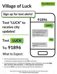 Village of Luck is excited to announce the launch of TextMyGov services as another convenient way for the Village to communicate with residents and visitors of Luck.
